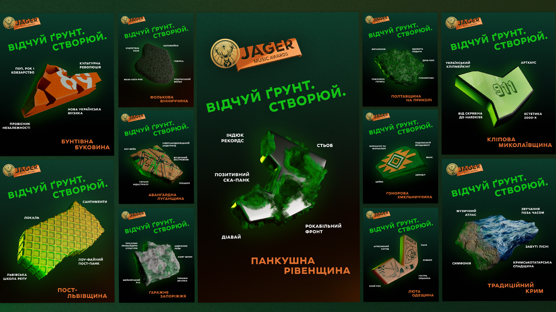 Концепція "Відчуй ґрунт. Створюй" вже була розроблена, і наше завдання полягало в тому, щоб підтримати її та адаптувати для соціальних мереж. Ми працювали з готовими креативами, в яких кожен елемент відображав конкретний "ґрунт", символізуючи культурні особливості різних регіонів України. Використовуючи кам'яні текстури та відтінки зеленого й помаранчевого кольору, ми підкреслювали автентичність стилів, таких як техно, чілвейв та фрік-рок, що відповідають загальній айдентиці бренду.