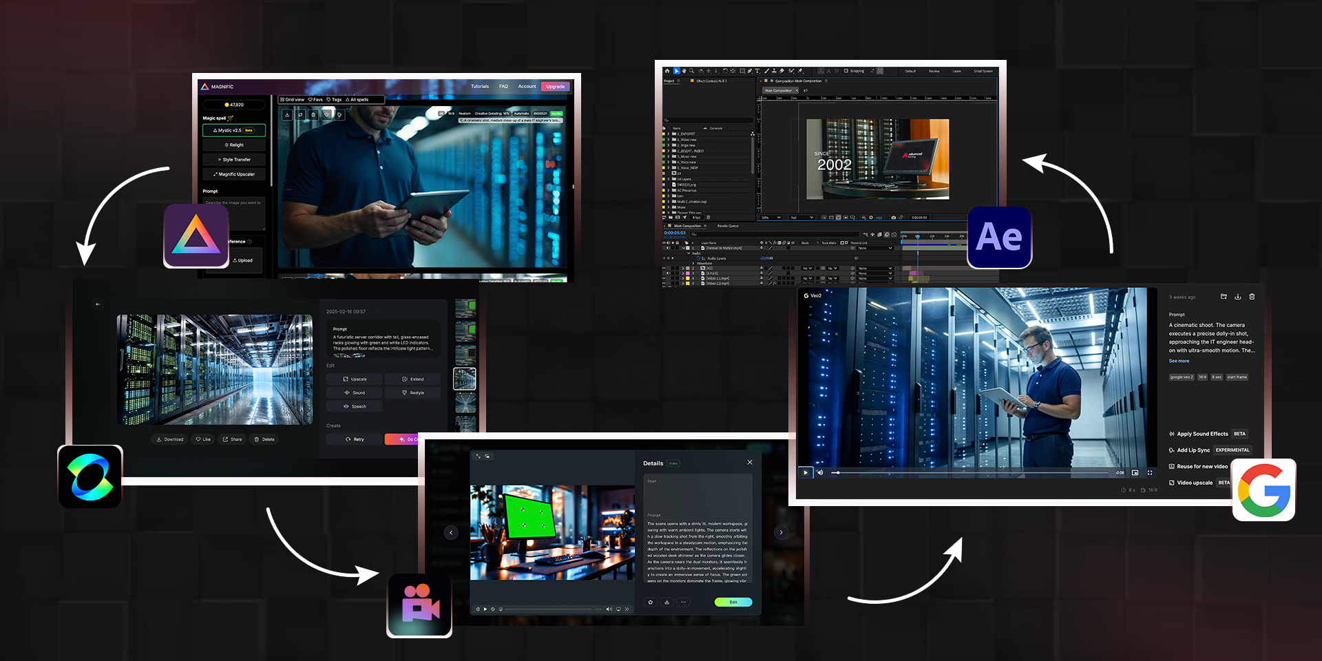 Продакшн відео розпочався зі створення мудборду, який визначив загальну стилістику та атмосферу проєкту, дозволивши сформувати єдиний візуальний напрямок, що підкреслює професіоналізм бренду. Для генерації зображень використовували Magnific AI у режимах Flexible та Super Real, що забезпечило високу фотореалістичність, особливо у кадрах із людьми та серверними приміщеннями. Додаткове покращення кольорового балансу й деталей виконували в Adobe FireFly, а фінальне підвищення чіткості здійснювали за допомогою Magnific AI від Freepik.