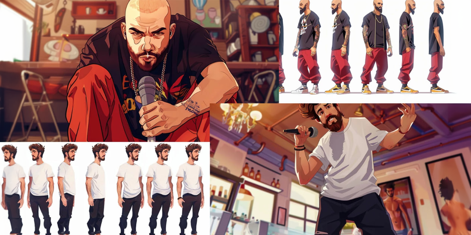 amazing character design, [30-year-old man, with brown fashionable hair, with a beard, wearing an oversized white T-shirt, black rapper pants, white sneakers], background [vintage coffee shop], character sheets in 6 different poses, full body, bright colours, complex details, high resolution, 8K --ar 16:9 --style raw