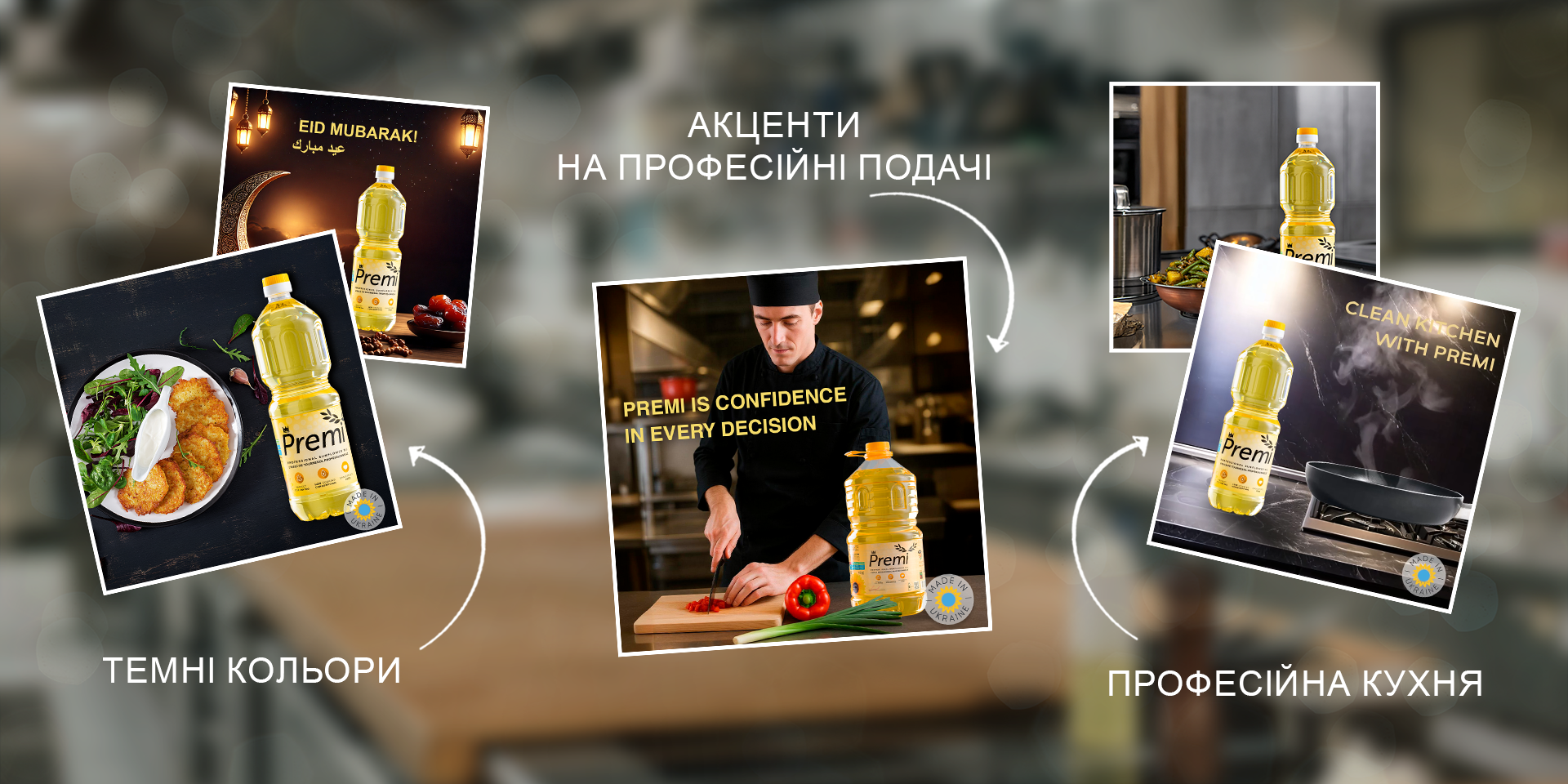 Premi позиціонується як олія професійної якості, що підходить як для шеф-кухарів, так і для кулінарів-аматорів. Ми акцентували увагу на преміальності продукту, використовуючи технологічні візуали та підкреслюючи українське походження бренду.