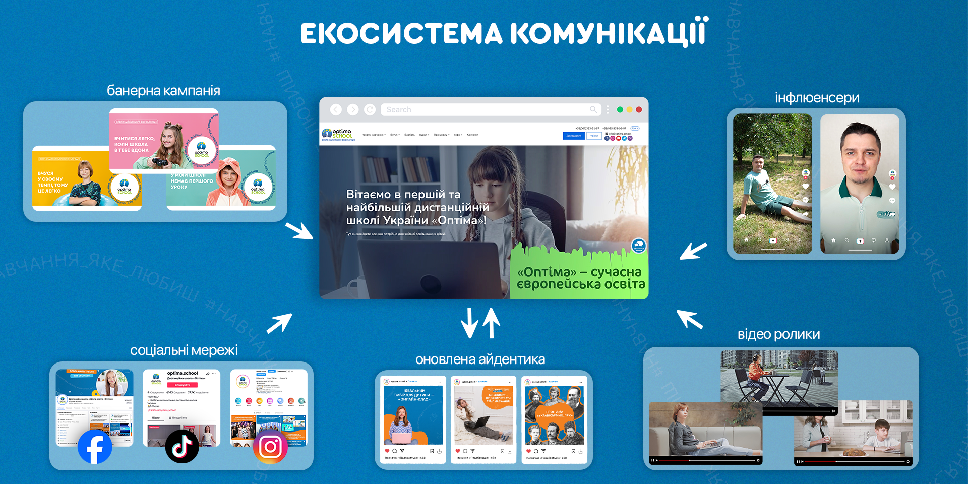 Для просування унікальної концепції Optima School ми розробили комплексну комунікаційну стратегію. Вона охоплювала різні канали комунікації, популярні як серед молоді, так і батьків.