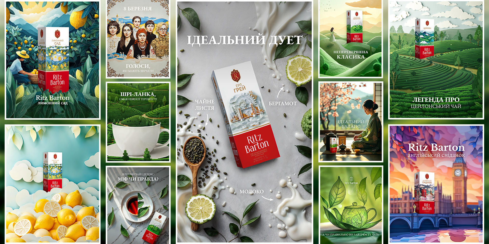 Ми спиралися на головну думку: звичайний чай — просто напій, але Ritz Barton — мистецтво чаювання та витонченість у кожній чашці. Завдяки йому оживають столітні традиції англійських салонів, де чашка чаю була не лише способом втамувати спрагу, а справжнім ритуалом — витонченим, сповненим глибини та сенсу.
