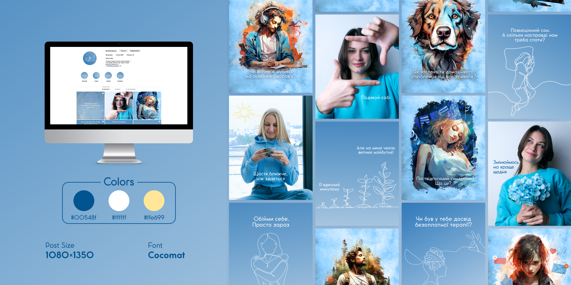 Основною задачею при розробці візуального стилю було створити «заспокійливий» контент. А також, викликати асоціацію з продуктом, не показуючи сам продукт. Саме тому було розроблено стиль в синьо-блакитних тонах з акцентним жовтим, а в оформленні переважали плавні лінії та градієнти. Весь візуальний контент умовно ділили на чотири блоки — фірмова графіка, ілюстрації, згенеровані ШІ, фотоконтент. Дотримання однієї колірної гами допомогло це все гармонійно поєднати.
