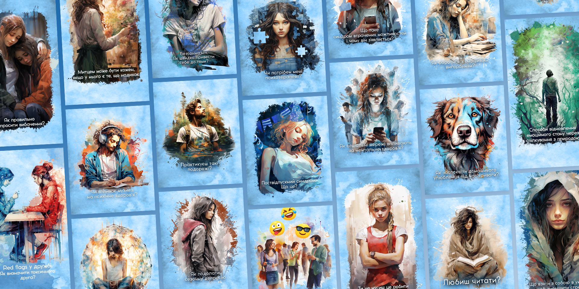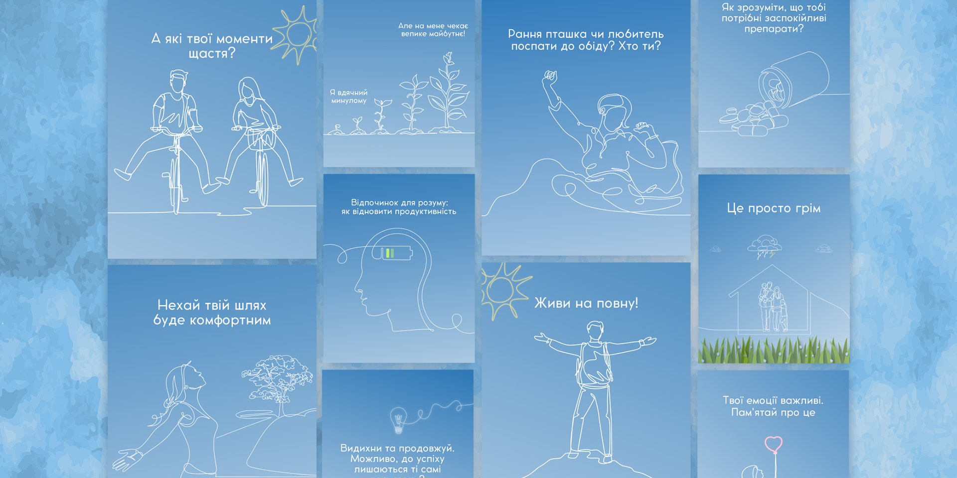 До навчального напряму ми включили публікації, які пов’язані зі здоров’ям, порадами щодо подолання стресу та практичними порадами. Вони були згенеровані за допомогою ШІ та складали 30% всього контенту. За необхідності, зображення допрацьовували на дизайні, а щоб гармонійно вписати ці ілюстрації в стрічку, була розроблена фонова «акварельна» текстура в кольорах бренду.