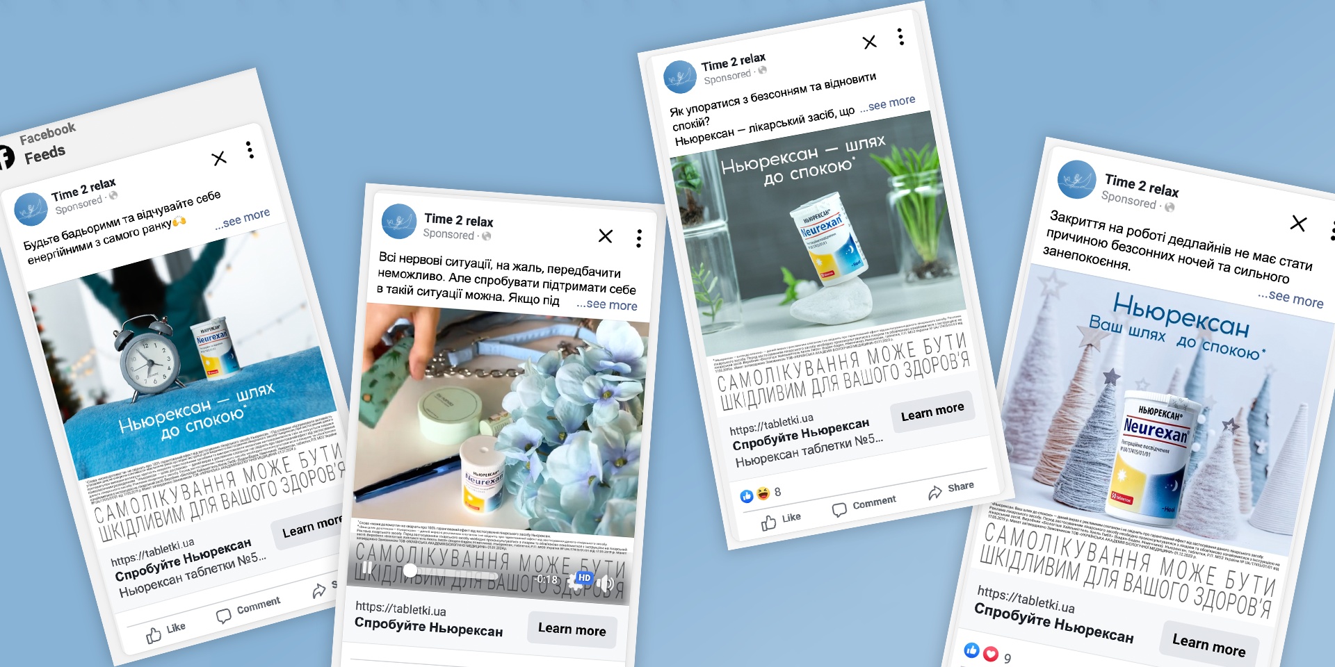 100% контенту ми присвятили психологічним темам, також публікували матеріал, який заспокоює, а за допомогою продуктових дарк-постів просували препарат. Як це відбувається: по кліку на рекламу юзер переходить на сторінку нашого релакс-ком’юніті або на сайт, де можна придбати лікарський засіб, залежно від формату контенту.