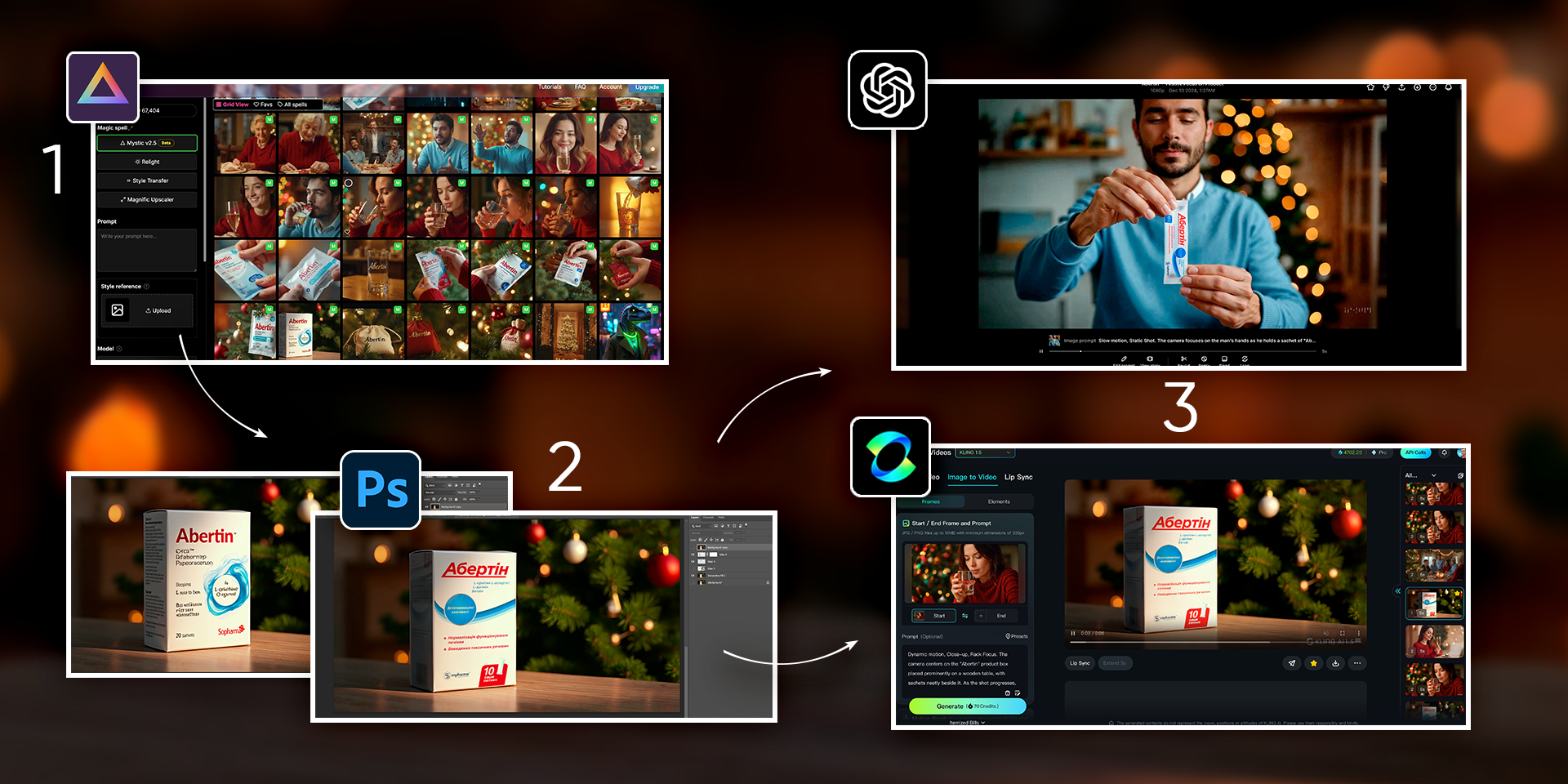 Для створення відео був застосований комплексний підхід, використовуючи найсучасніші AI-інструменти. Завдяки Magnific AI з моделлю Realism ми отримали реалістичні кадри з правильною глибиною різкості та м’яким боке від вогників гірлянд, що додало святкової чарівності кожній сцені. Adobe FireFly та Freepik Retouch забезпечили точну передачу текстур і деталей, особливо у крупних планах препарату, акцентуючи увагу на його якості та зручності використання.
