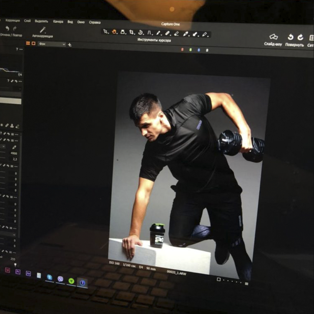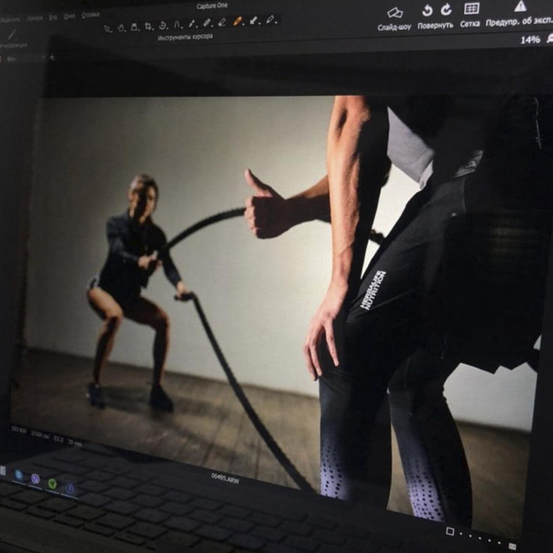 Для спортивних фото потрібен відповідний антураж, тому одним з найважливіших завдань було перетворення звичайної фотостудії на спортивну залу. Для цього ми придбали гантелі, степпер, килимки, боксерські лапи, доріжку для функціональних тренувань, скакалки тощо. Ці речі допомогли нам відтворити потрібну атмосферу.